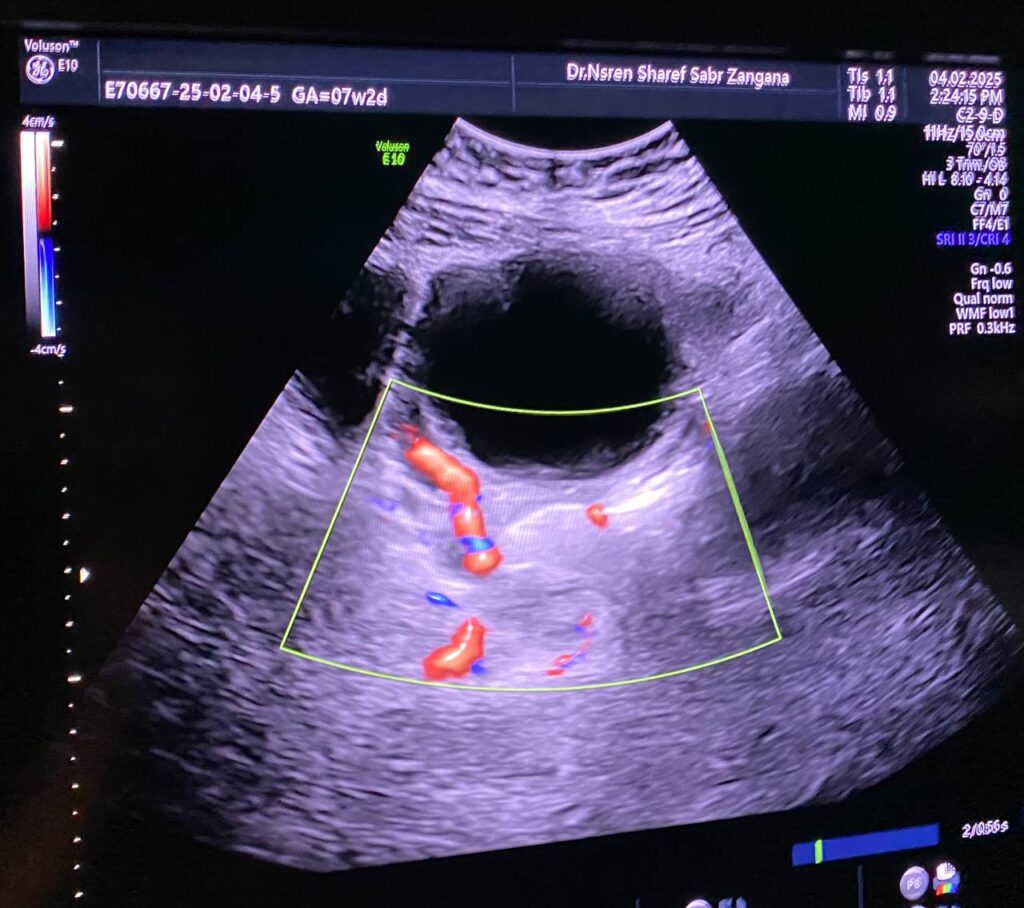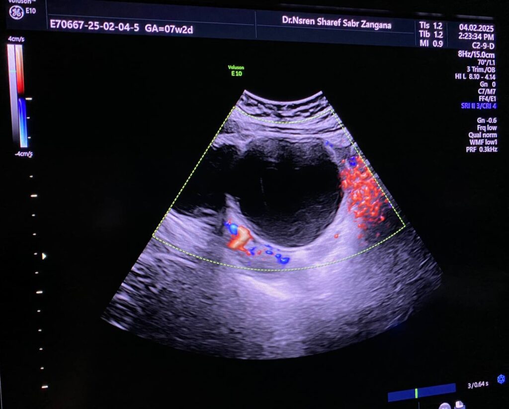 Lt ovary is enlarged and edematous, contains 7cm thin wall unilocular cyst “ORADS 1”, there is twisting of its vascular pedicle, picture of ovarian torsion.