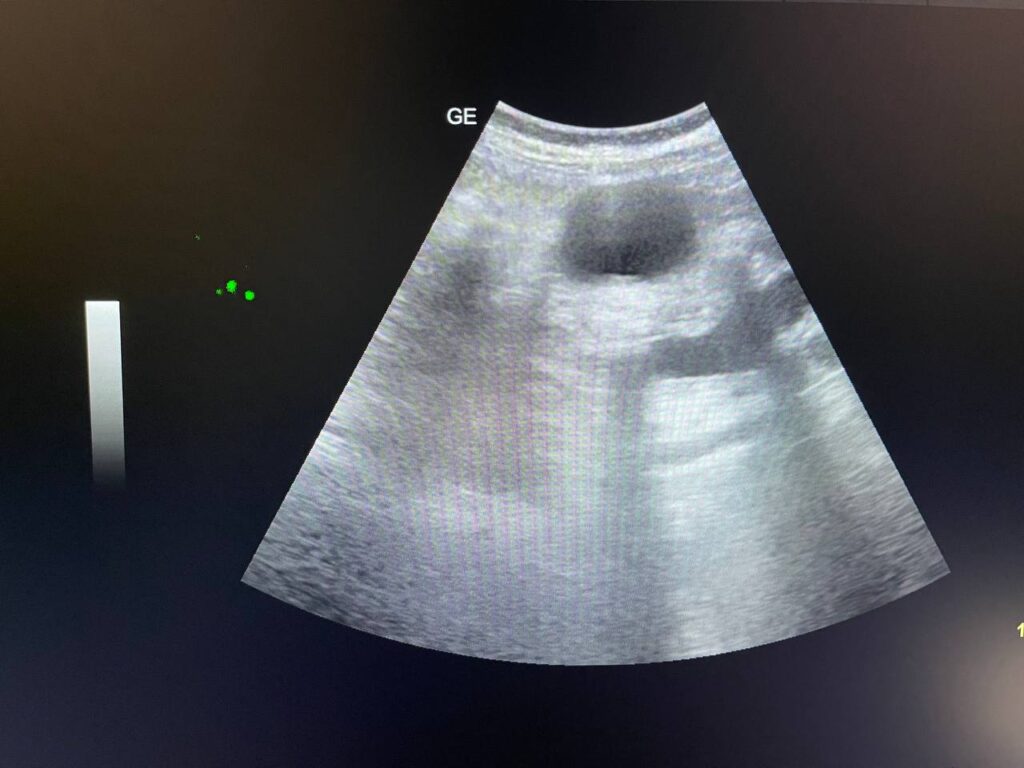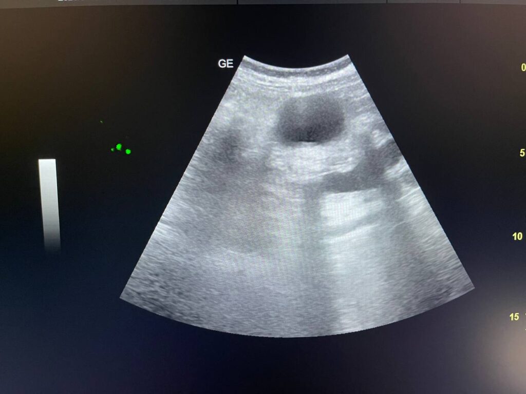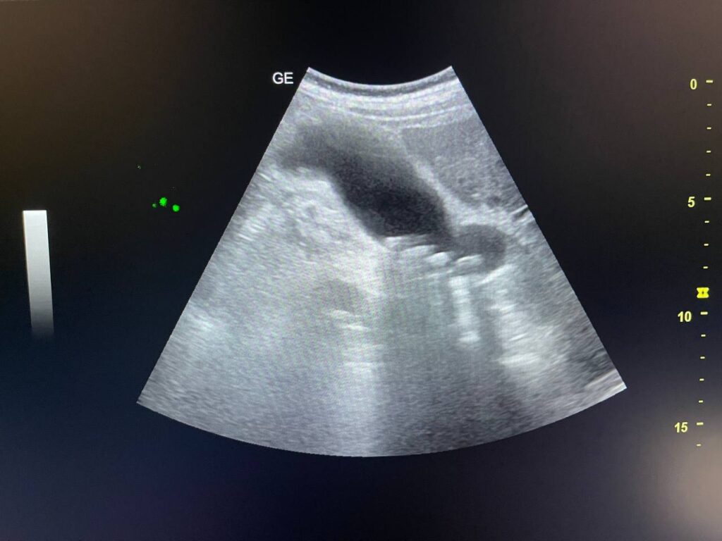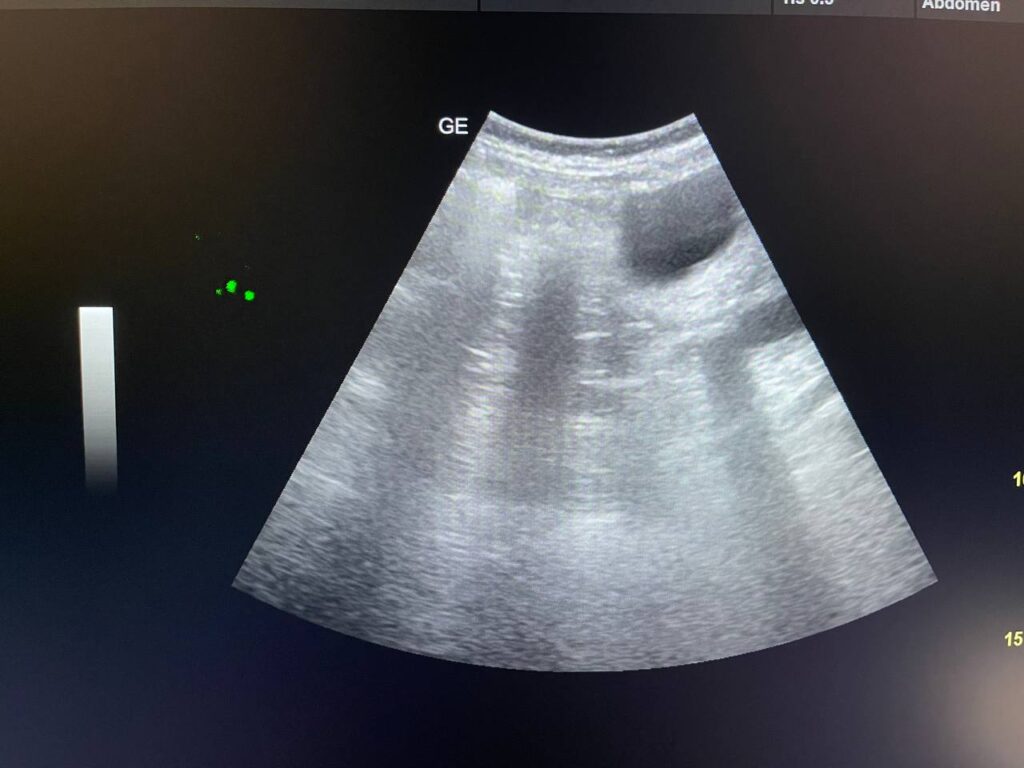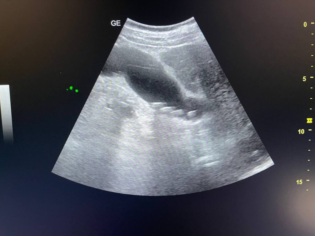 Gall bladder distended,  increase wall thickness 5.5mm edematous, contain multiple mobile stones of variable sizes , the largest 12mm + dilated common bile duct 13mm , due to presence of stone about 25mm in the distal part