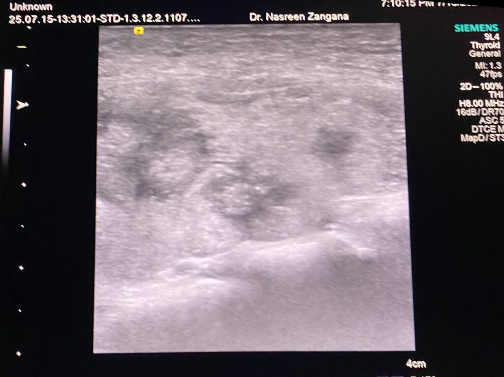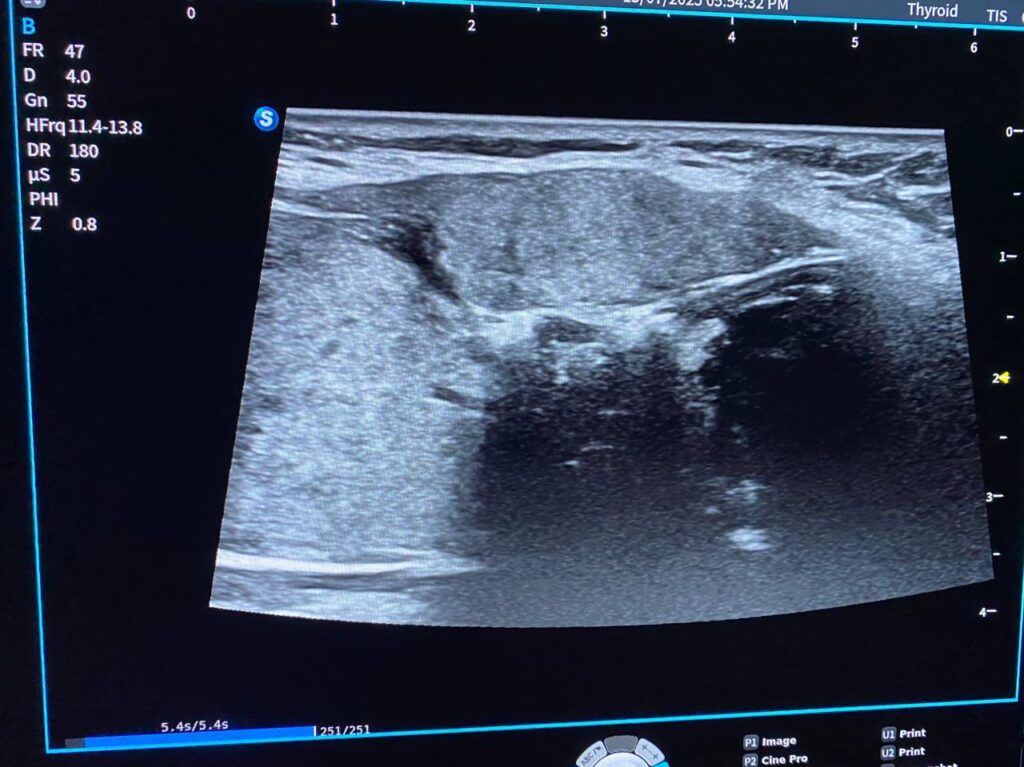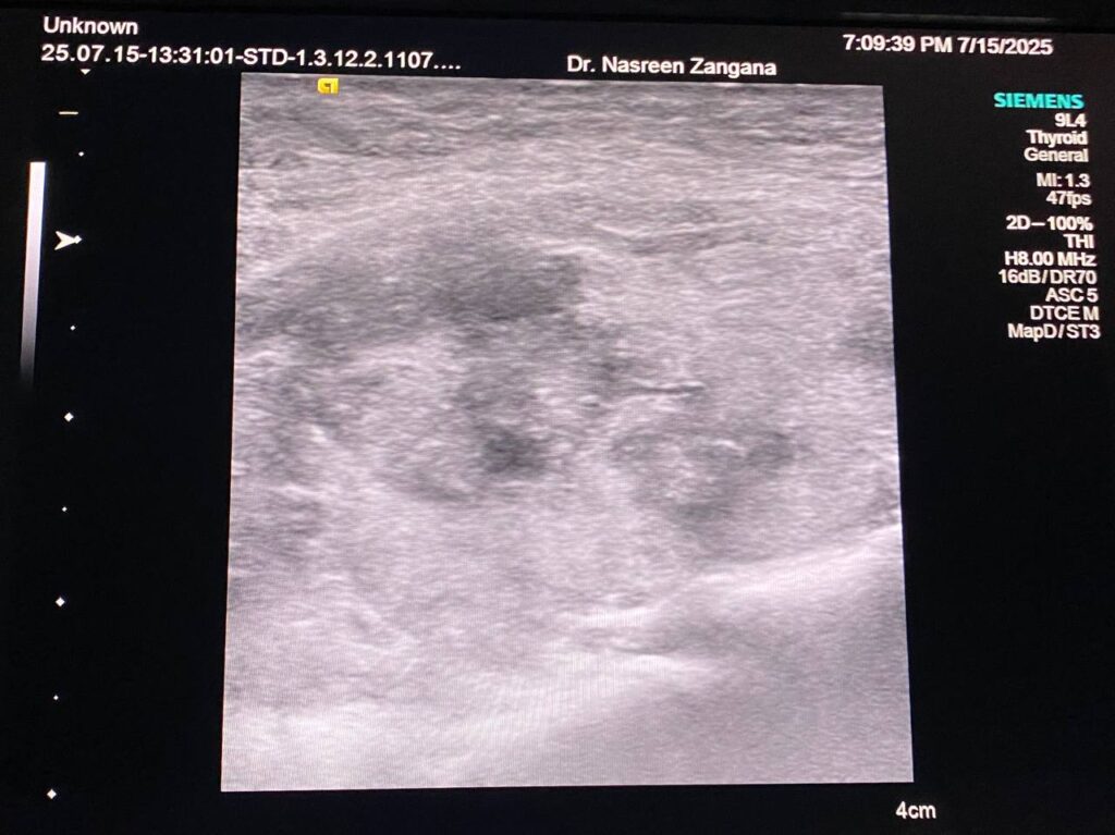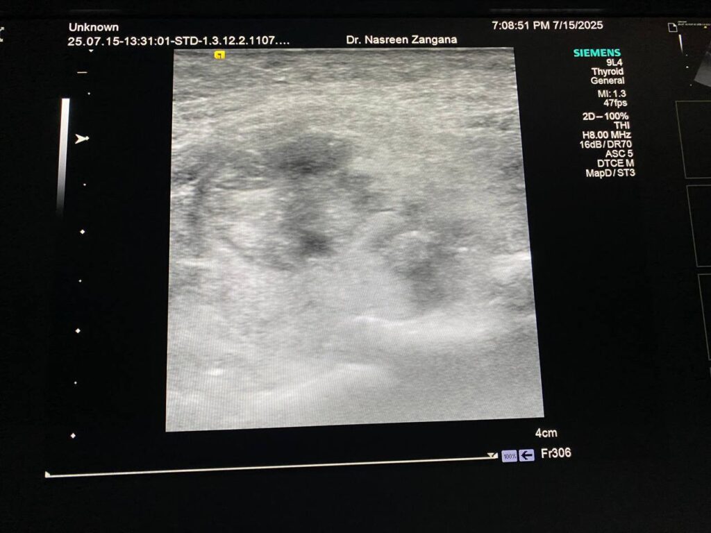 The gland diffusely has lobulated outline, geographic heterogenous multiple hypo-echoic areas, ill-defined nodules <  3mm in sizes, with inter-digitating fibrosis, interrupted capsule, Picture of Hashimoto’s thyroiditis , left lobe contain ill distinct margin mass , its size 18.5×15.5mm, bulging the capsule , with irregular lateral margin , vascular on color Doppler , contain microcalcification , other two adjacent hypoechoic irregular masses are seen 11.8×7.8mm (also contain microcalcifications)  & 4.7×3.8mm  , all are mostly suspicious TIRADS 4 , please for further study