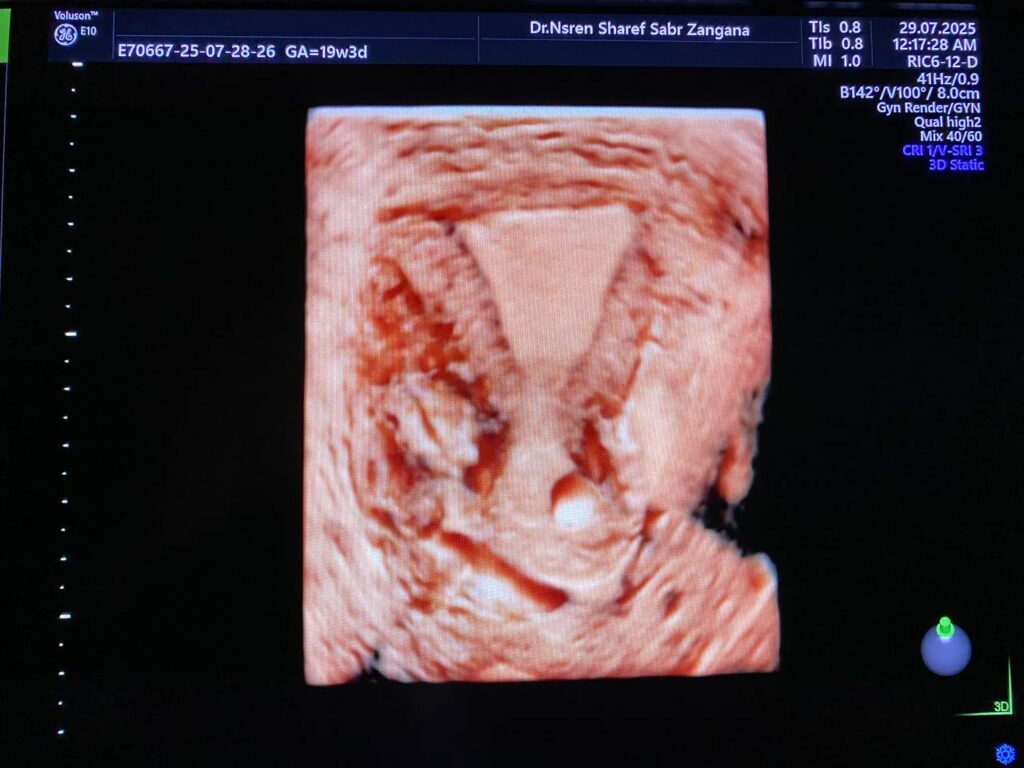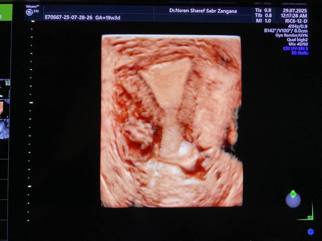 Bulky size A/V uterus, endometrial lining thickness 13mm, with presence of heterogenous cystic lesion in the right sided lower lateral body 22x2mm , mostly accessory cavity uterine malformation ACUM,  no fibroid,    single Nabothian cysts in the anterior lip of the cervix,  its size11x8mm .
