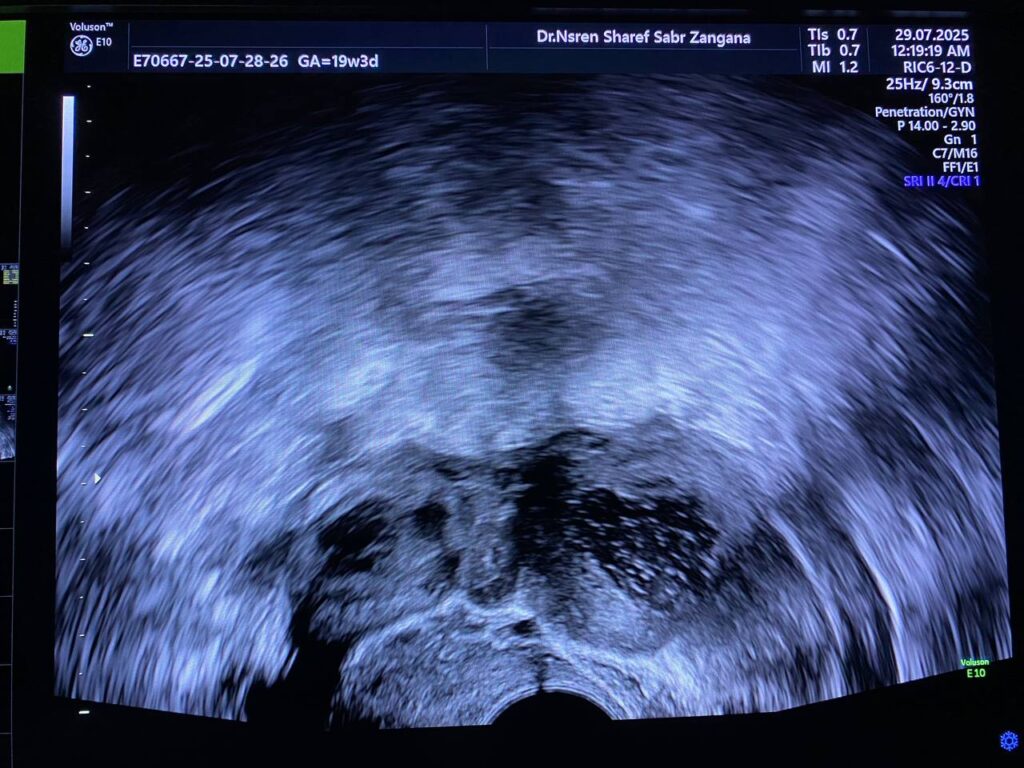 Both ovaries are enlarged in sizes, with increase stromal echogenicity, multiple small follicles > 25 in number, in each ovary, their sizes less than 5mm, with presence of single corpus luteum in the right ovary, its size 15mm, in favors of polycystic like ovaries, should be correlated with clinical picture & hormonal assay