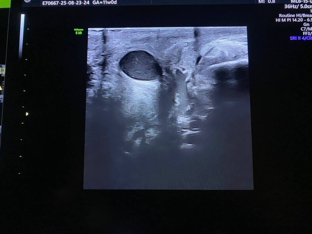 Bartholin Cyst 28/08/2025 · Nasrin Zangana Presence of cystic mass 13.3×9.5mm , in the lower vaginal canal, about 7mm far from the skin ,mostly Bartholin cyst