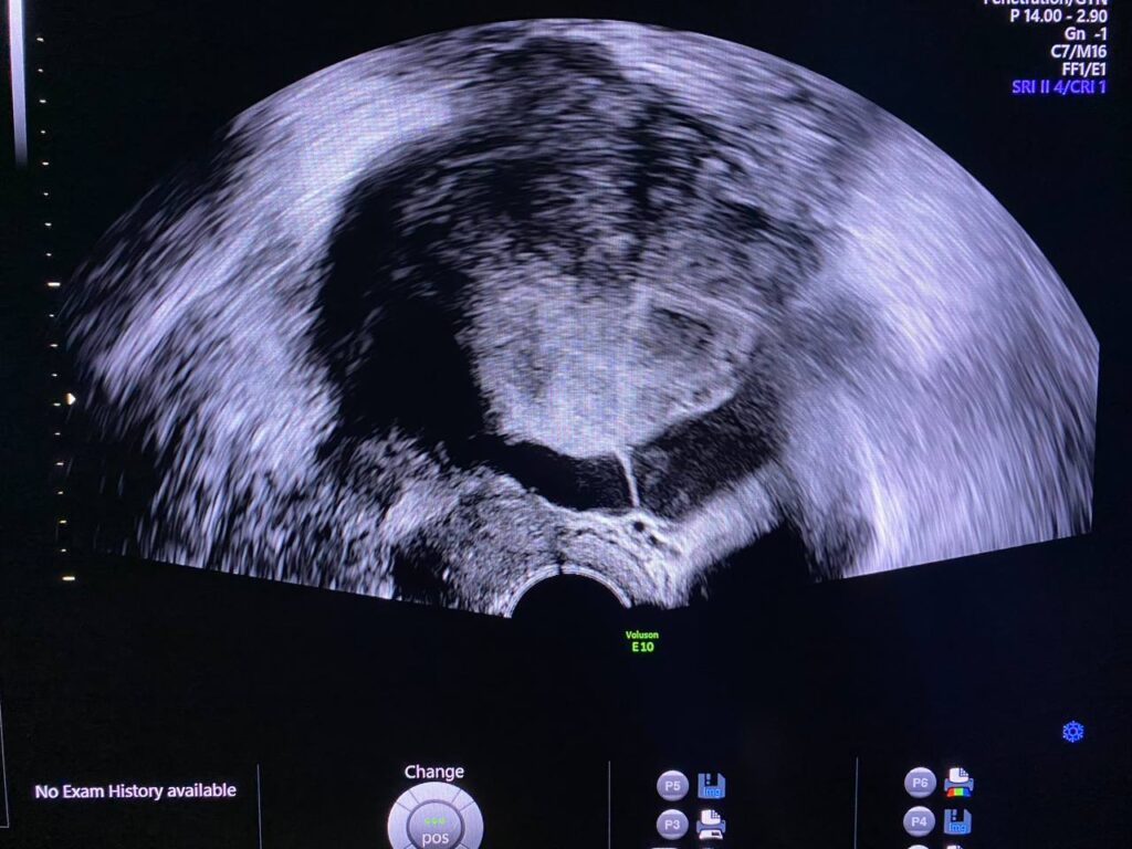 Presence of heterogeneous collected fluid > 115x70X88mm , around the uterus and both ovaries , with presence of lines of adhesions within connected to the uterus , picture mostly of endometriosis deposit