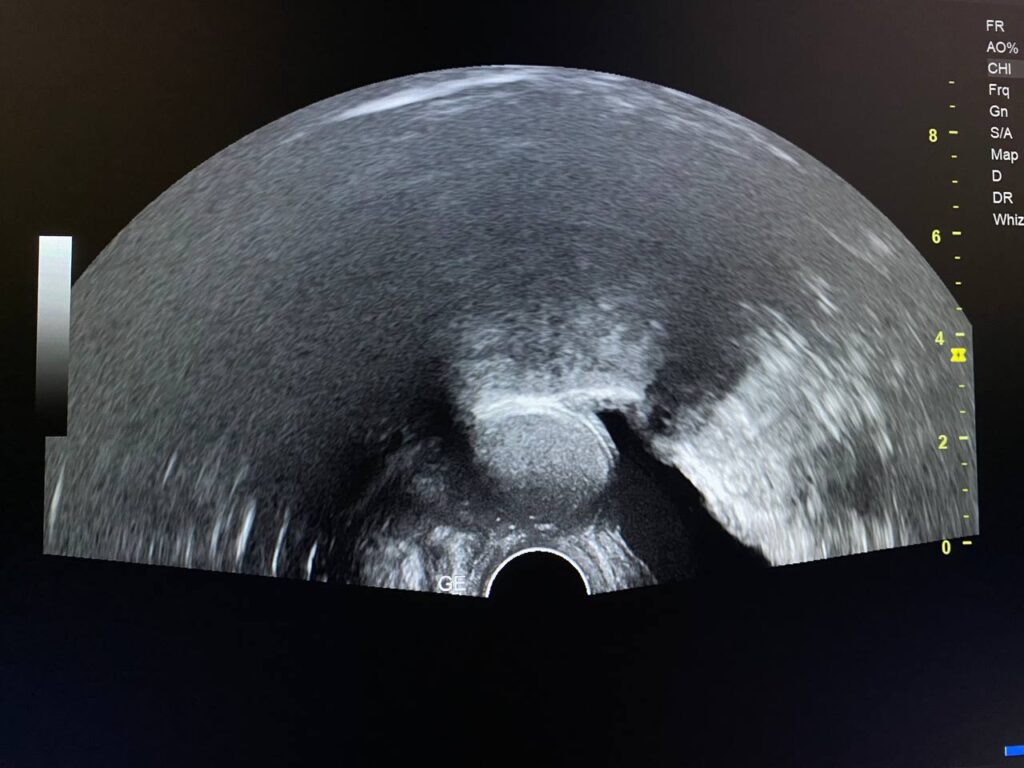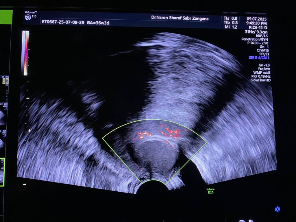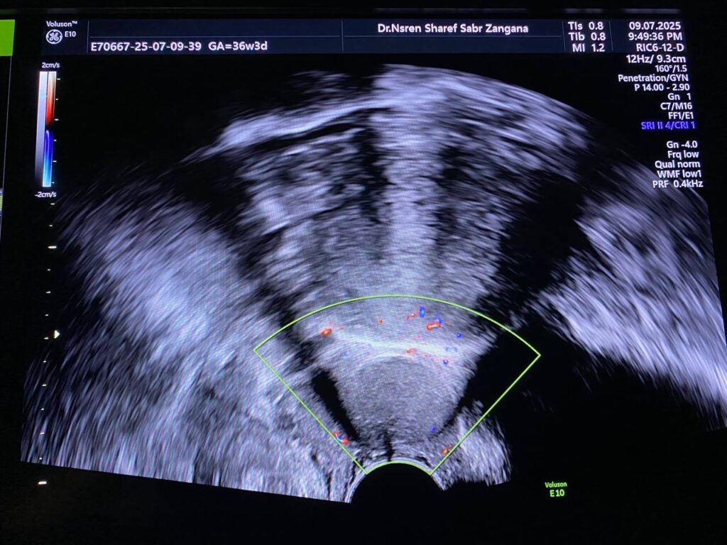 presence of well defined avascular heterogenous cystic mass 26x21mm , between the corpocervical junction and posterior urinary bladder , mostly endometriosis