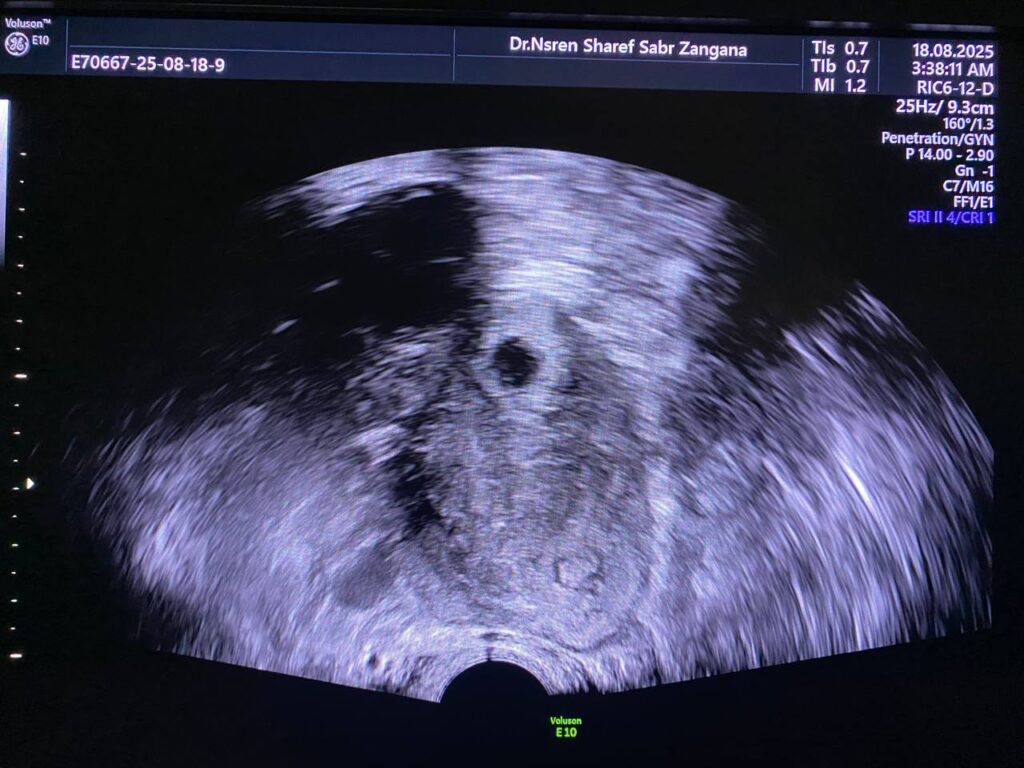 Gravid uterus with single of gestational sac (early pregnancy), contain yolk sac & small fetal pole, The sac located in the right cornua , picture mostly of interstitial ectopic pregnancy ?  , please for follow up