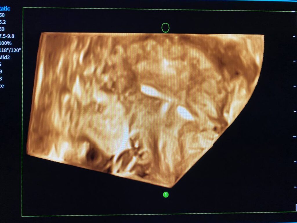 Normal size uterus, endometrial lining thickness 4mm, with IUD about 12mm lower than normal site & left transverse limb  piercing the adjacent myometrial layer, clear endo-myometrial junctional zone, no fibroid