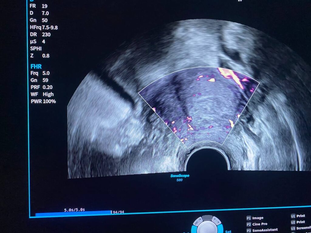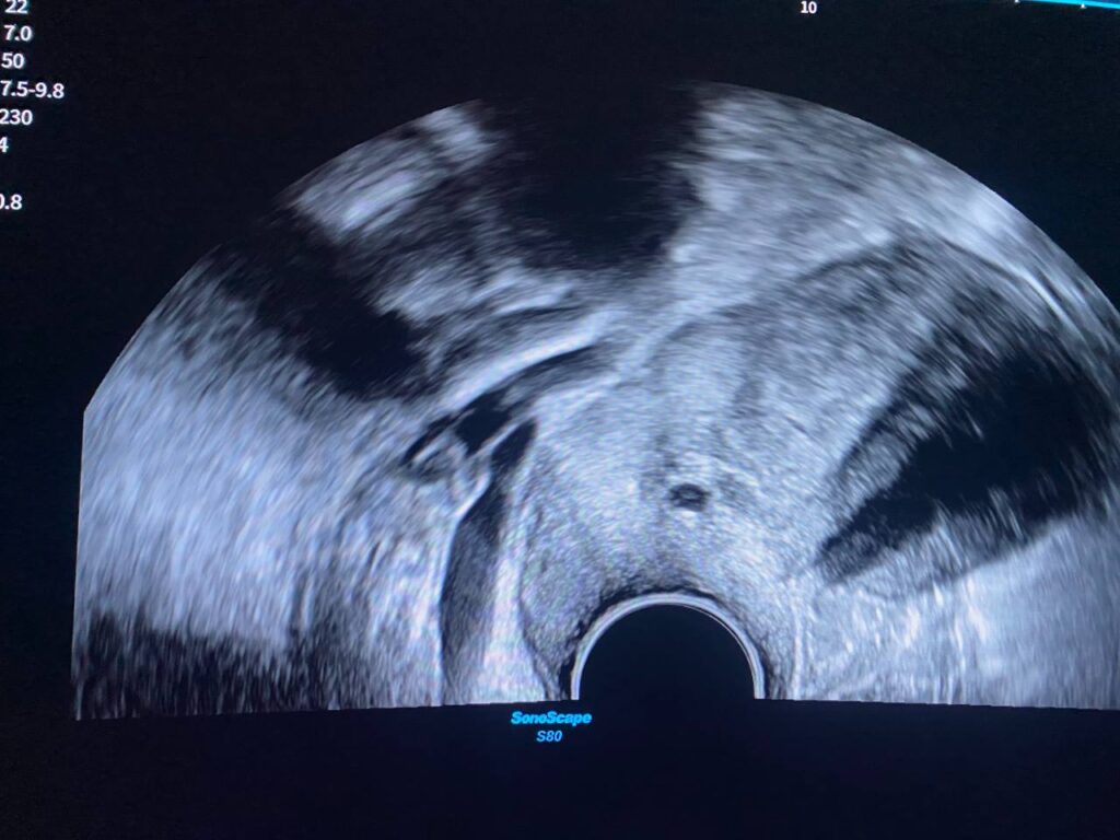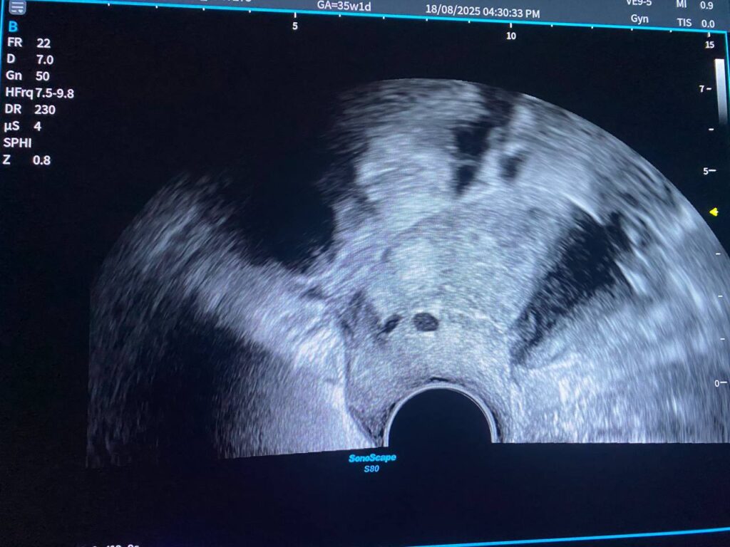 Presence of isoechoic heterogenous avascular area size 23x13x28mm, within the uterine cavity at level of internal os , mostly old retained piece of gestation, clear endo-myometrial junctional zone, no fibroid