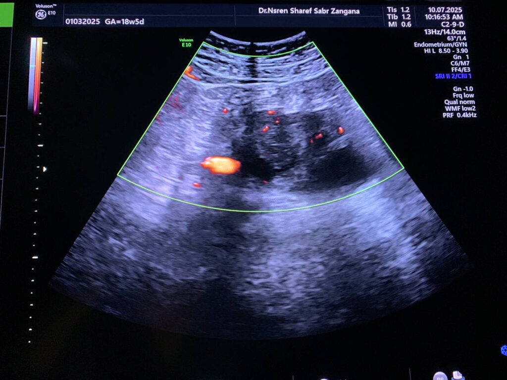 · Bulky size uterus, endometrial lining thickness 13mm, clear endo-myometrial junctional zone, the myometrial layer is heterogenous in texture, no fibroid