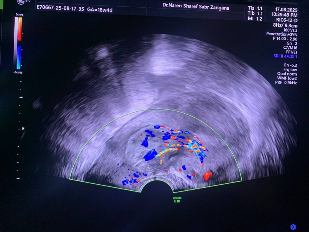 presence of vascular heterogeneous mass 28x45mm in the lower uterine cavity and internal os level , arise from the right sided anterior wall , pedunculated submucosal fibroid can not be excldued .