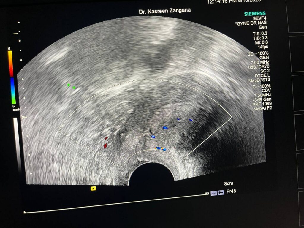 Pelvic U/S 10/08/2025 · Nasrin Zangana presence of hyperechoic mass within the cavity 30x10mm, mostly polyp or could be pedunculated submucosal fibroid