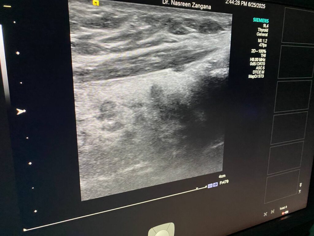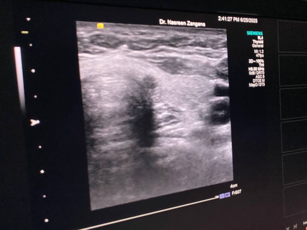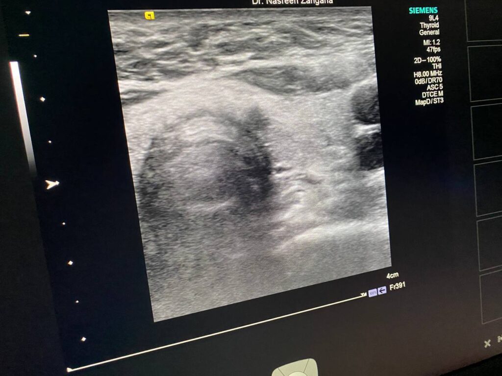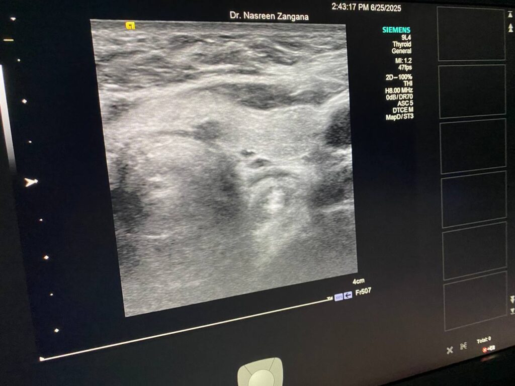 in the left sided of the isthmus presence of two hypoechoic masses , size 3.2×3.3mm, it has indistinct margin , suspicious nodule can not be exclude for further study , the other mass 3.6×2.4mm more regular , mostly lymph node , please for further study TIRADS U4