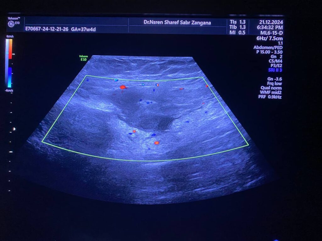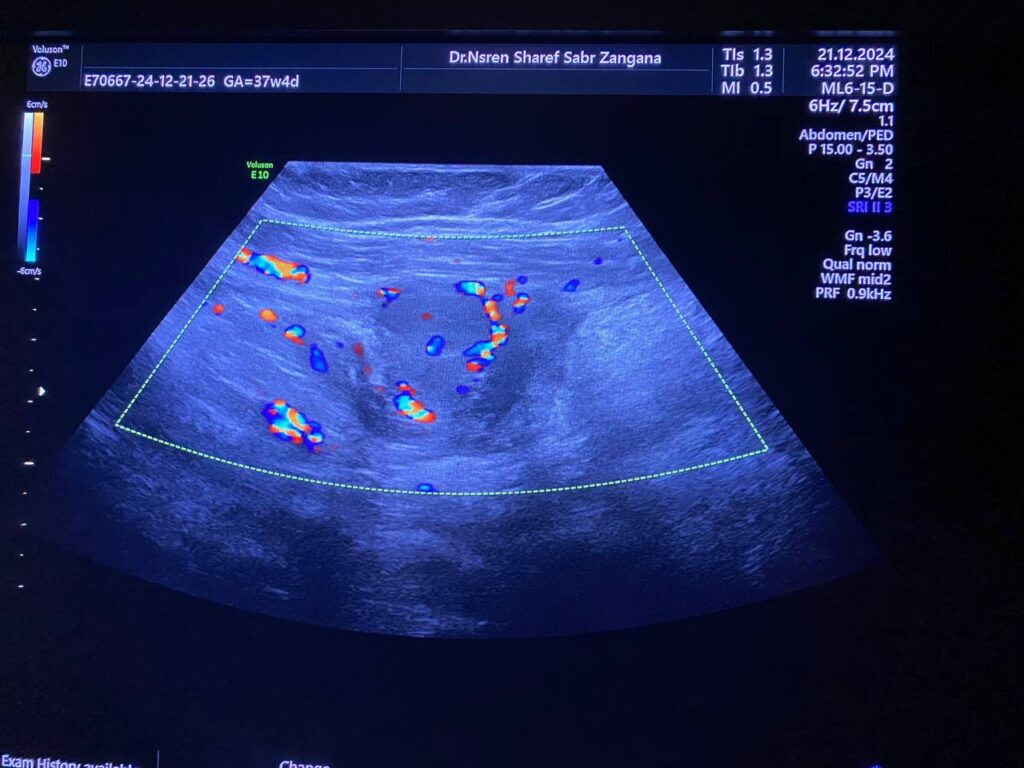 ·      Left ovary , normal in size , no dominate follicle    , with presence of heterogenous vascular solid mass, contain calcification size about 44x30mm with indistinct margin, vascular on color doppler, score 3-4 located  just the lateral to the left ovary  , with invasion of the adjacent peritoneal & muscular layer ( left rectus abdominis muscle) , mostly suspicious mass , its invasion to the left ovary cannot be excluded  , picture could be Desmoid tumor ? peritoneal tumor > , for further study please    . no suspicious lymph node seen